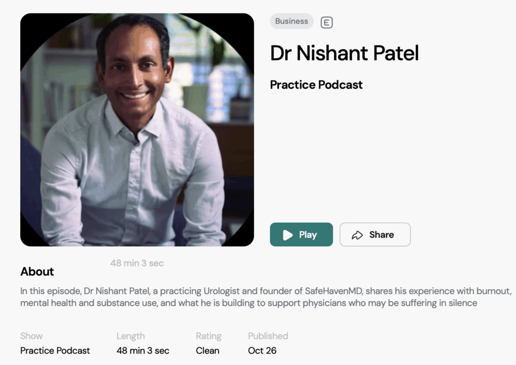 Over the years, I’ve shared my journey openly, from addiction, depression, and burnout to recovery and resilience. These conversations capture not just my story, but the struggles and healing that so many physicians quietly face. SafeHavenMD was born from this truth.